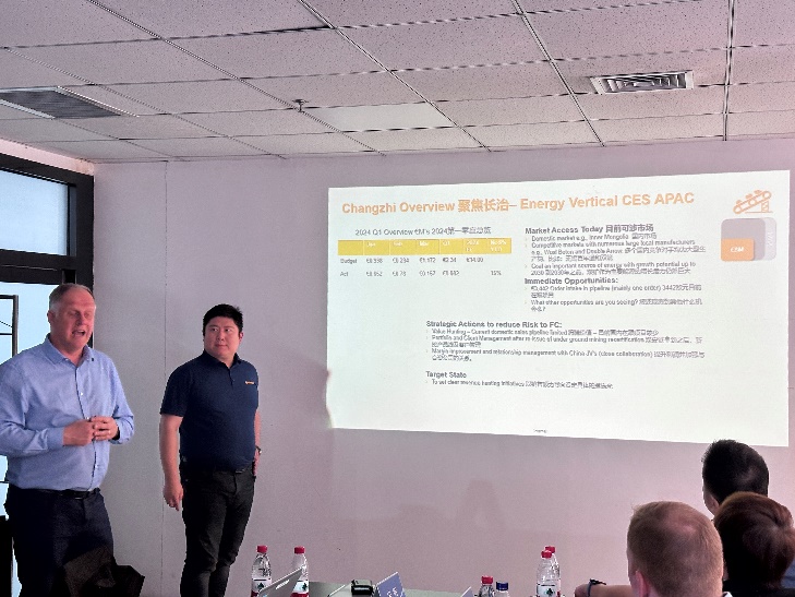 2024年4月24—25日,WhiffinPaul (Head of APAC CESL)帶領(lǐng)亞太區(qū)客戶工程服務(wù)團(tuán)隊(duì),Herwig Peters(Head ofPD APAC),JennyYu(Head of CS PD /Head of Hydrogen center)帶領(lǐng)亞太區(qū)產(chǎn)品研發(fā)團(tuán)隊(duì),Leonie Zingel(Headof Marketing Communications)和高瀚文(Market StrategyTeam Business Development)帶領(lǐng)市場開發(fā)團(tuán)隊(duì),到公司就銷售市場的開發(fā)和技術(shù)支持進(jìn)行深度調(diào)研和指導(dǎo)。